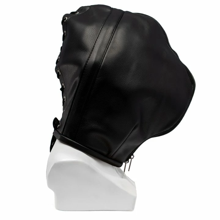 Down the back, the lace-up design is easily adjusted and tied for a comfortable and secure fit. The full-face mask quickly removes your identity, while leaving mouth, eye and nose holes for comfortable breathing and explicit activities. Be warned: should you disappoint your Master or Mistress, one pull of the zip and your entire face will be covered, leaving you completely alone and in the dark.