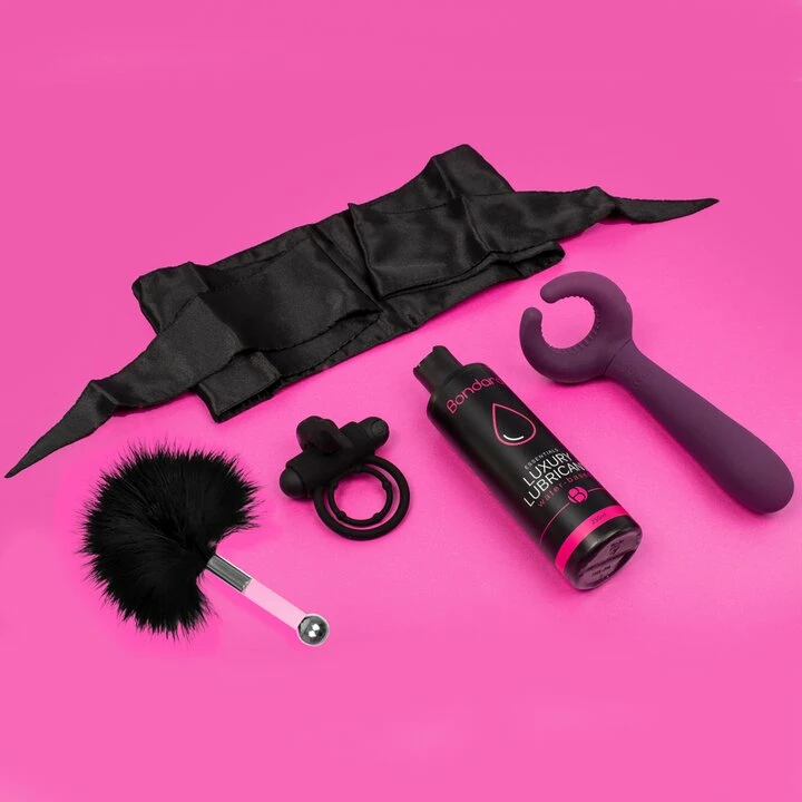 β’ Includes a vibrating rabbit cock ring, a multiway couples’ vibrator, a 250ml bottle of luxury lubricant, a fluffy feather tickler and a satin blindfold scarf