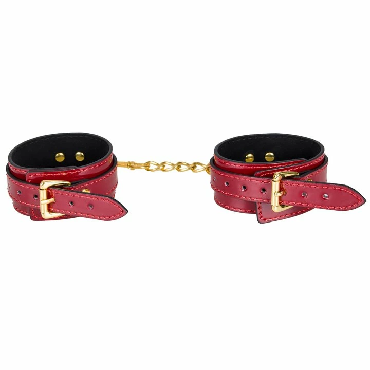 β’ Red faux leather handcuffs with contrasting, black inner liningΒ