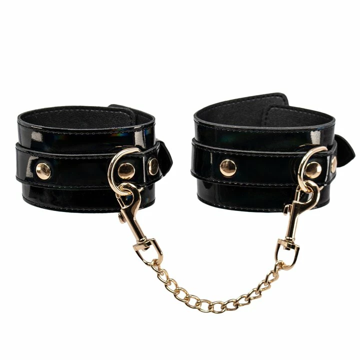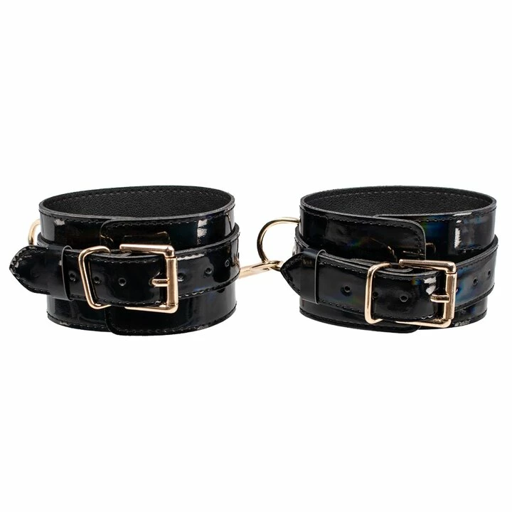 These high-shine restraints glisten with a rainbow iridescence and gold-tone hardware for a fashionable bondage aesthetic.