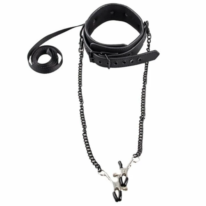 β’ Three-piece restraint includes a collar with a detachable leash and nipple clamps
