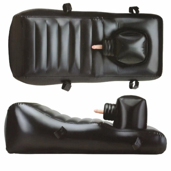 β’ Inflatable sex bed with single speed thrusting dildo attachment and Velcro wrist and ankle cuffs for effective restraint.