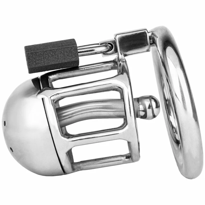 A punishing solution for subs who won’t stop touching their tackle; satisfy your sadistic side and leave him begging for pleasure – just don’t lose the keys! Suitable for beginners and beyond with an open, ventilated design, this extra small cock and ball device confines the most minuscule of willies, forcing them to stay flaccid in just 2.4-inches of confinement for thrilling orgasm denial. Add to your sub’s humiliation with the torturous arousal of the built-in penis plug.Β