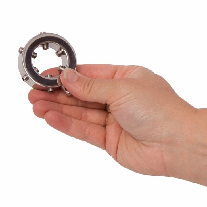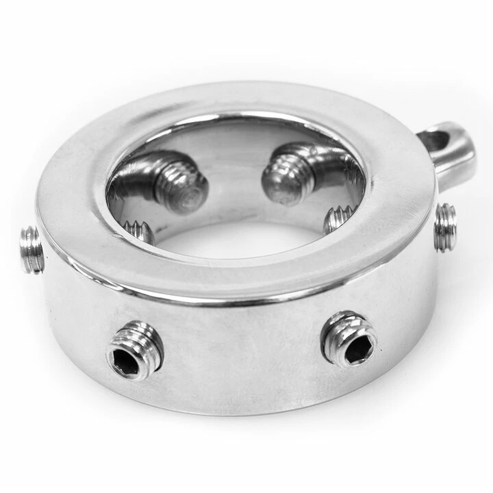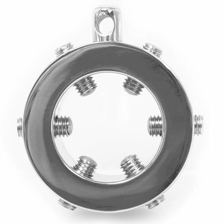 This hardcore cock crusher indulges your sadomasochistic sensibilities with six flat-ended screws threaded through the crown, securing the 27mm ring around the glans. To exact a punitive punishment; Dom(me)s administer a crippling crunch to their captive’s cock by incrementally turning the screws, while the hanger provides the perfect position to burden their bell end with weights or attach a bondage leash for total penis power.